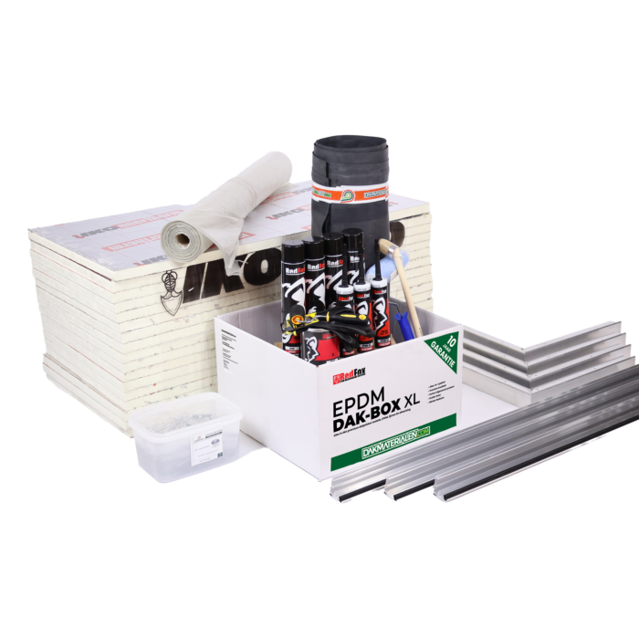 Ga je een dak maken? Zie je door de bomen het bos niet? Wij helpen je met het meest complete EPDM-dakpakket voor platte daken van tuinhuizen, garages en veranda’s. Inclusief topkwaliteit EPDM (Redfox US EPDM - KOMO), alle lijmen, primer, kit, HWA, gereedschap en (optioneel) PIR-isolatie met dampremmer. Alles is perfect op elkaar afgestemd — je hoeft niks meer uit te zoeken of bij te kopen.